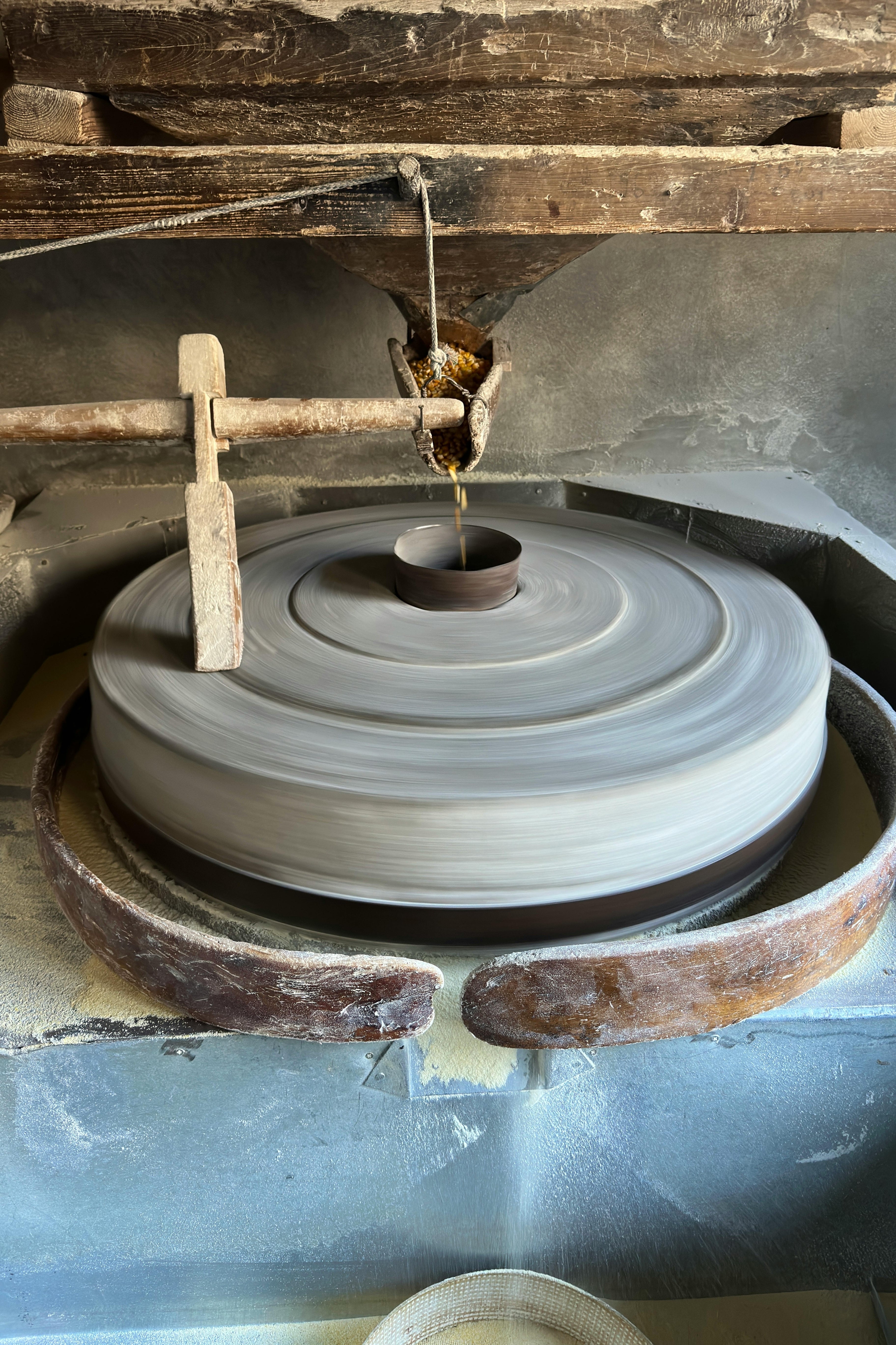 Après la torréfaction, les noyaux sont broyés selon la méthode traditionnelle à la meule de pierre. Ce procédé ancestral permet d’obtenir une poudre fine et homogène, sans échauffement excessif, ce qui préserve les arômes et les propriétés naturelles du produit.